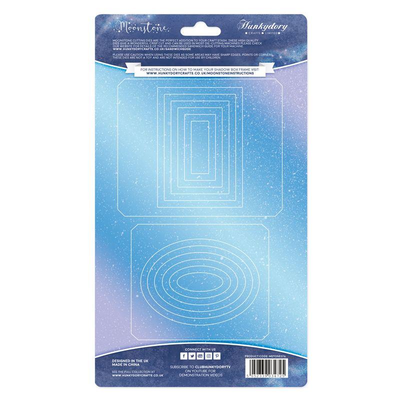 Make stunning shadow boxes and layered scenes with the Moonstone Dies Shadow Boxes Collection. This set is an absolute essential for your craft stash. This set contains 14 individual metal dies; 6 rectangle nesting dies, 6 oval nesting dies and 2 borders that will make up the outer box.
