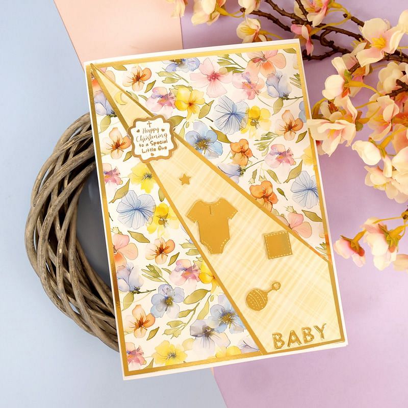 The Moonstone Limited Edition Dies - New Baby includes an adorable baby onesie with cute stitched details and sweet rattle. Create wooden building blocks with the stitched square, and decorate with the individual ‘Baby’ letters, moon or star. Cut and colour using Prism colouring mediums or cut from coloured cardstock, patterned papers or even material like felt. This fabulous die set makes beautiful new baby cards, baby shower invitations or even announcement cards.