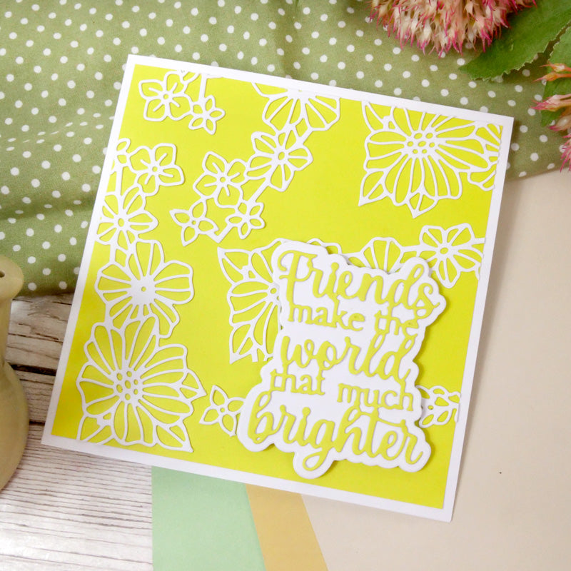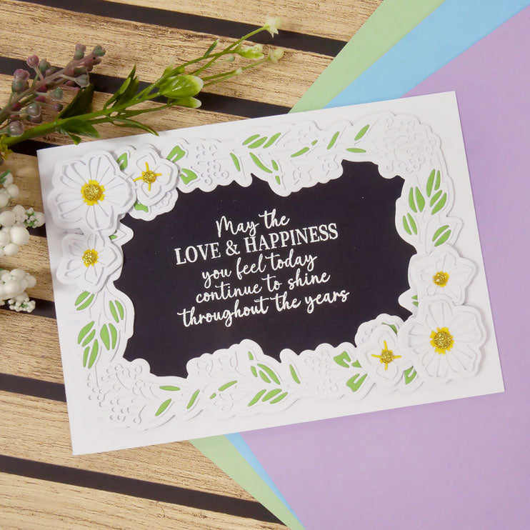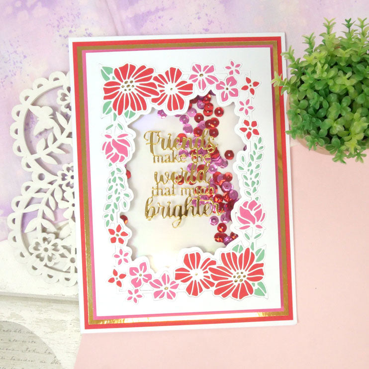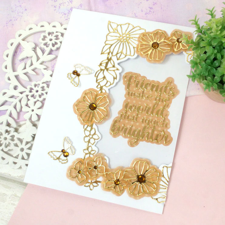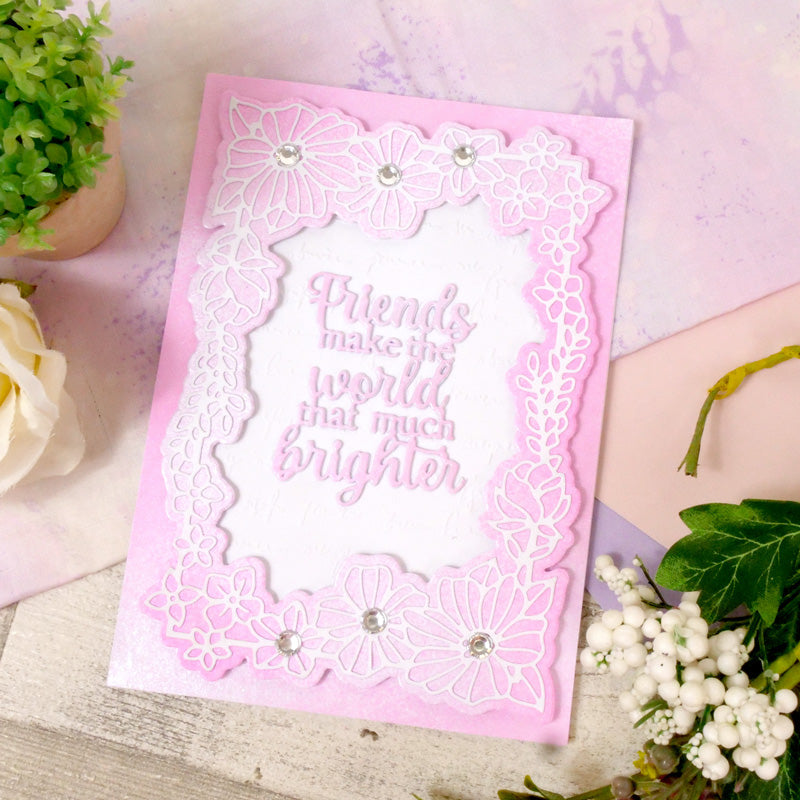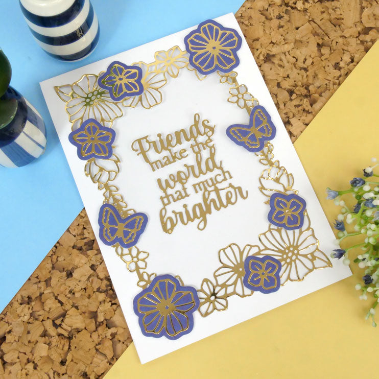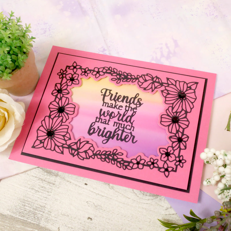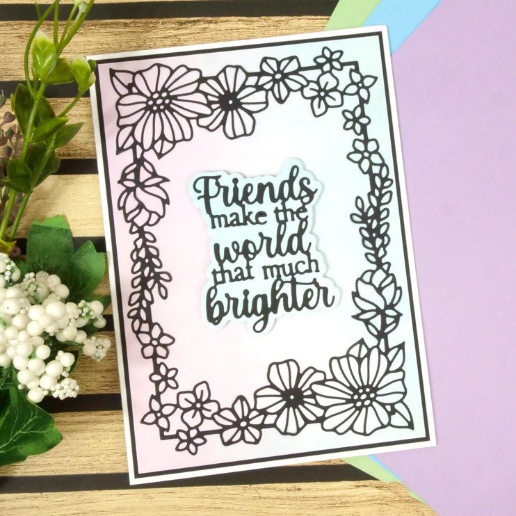 Create stunning floral frames with the Moonstone Dies - Framed with Garden Flowers die set. The set features a large frame that sits beautifully on a card 7” x 5” or larger and is adorned by a variety of flowers and leaves. Simply cut the frame from Ink Me! Cardstock and colour using the range of Prism colouring mediums. Alternatively, try cutting multiple from Adorable Scorable Cardstock, fussy cut elements out and layer for added dimension. The set also includes outer and inner dies that perfectly align with the frame to create stunning mats, layers, apertures and more! Complete your crafty creation with the gorgeous sentiment and co-ordinating mat; the sentiment reads ‘Friends make the world that much brighter’.
