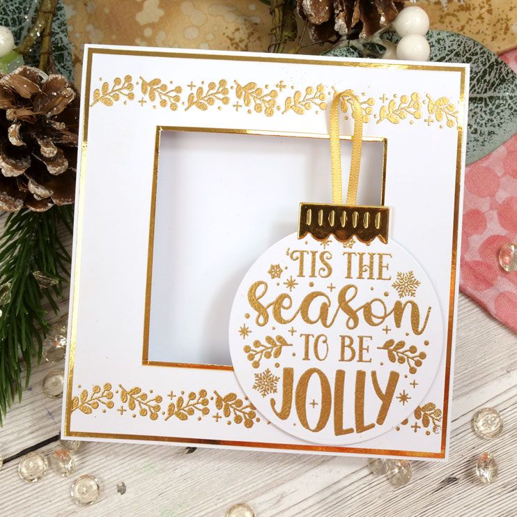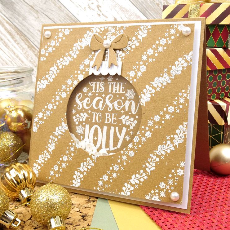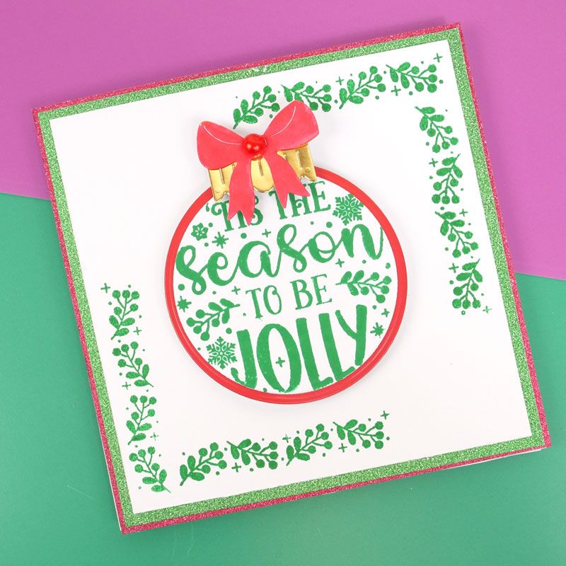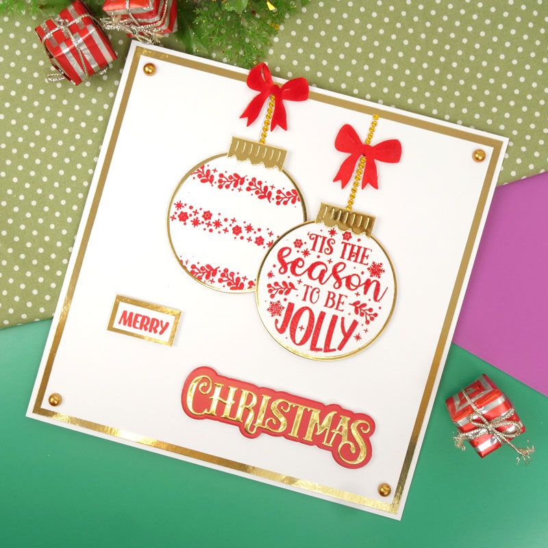 This clever set includes a beautifully decorated sentiment stamp that reads ‘’Tis the season to be jolly’ that is shaped to fit perfectly upon a die-cut bauble. Alternatively, cut an aperture into card blanks and stamp the sentiment inside for a totally different look. The stamp set also includes 2 co-ordinating border strips that can be used to decorate a die-cut bauble, or backgrounds, borders and corners.