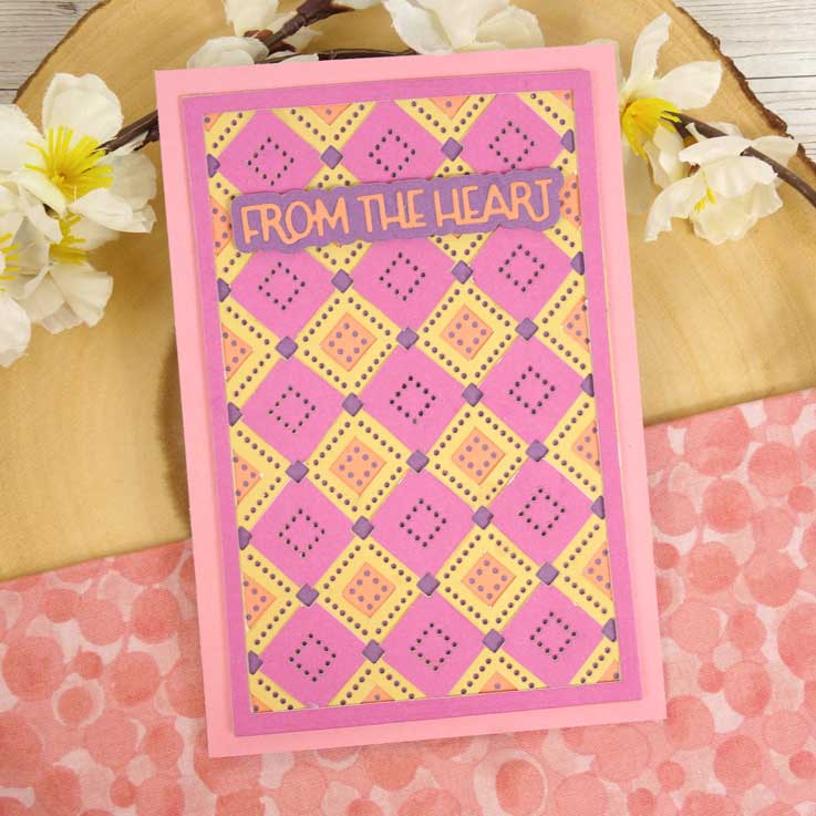 The die-cut panel can also be stitched into using thread or cotton to create a textured background, or simply link each hole with a pen for a faux stitched look. Try inking through a die-cut panel, similar to a stencil or mask, for a unique look that can be used time and time again.