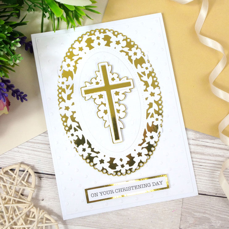 The Moonstone Dies - Blossoming Cross includes a lovely floral cross centrepiece and co-ordinating mat layer. Cut from coloured or lightly patterned cardstock and layer to create a striking centrepiece. Alternatively, colour the flowers with Prism colouring mediums for added detail and dimension. The stunning centrepiece is ideal for a variety of occasions including sympathy, wedding, anniversary, Christening, Holy Communion and so much more!