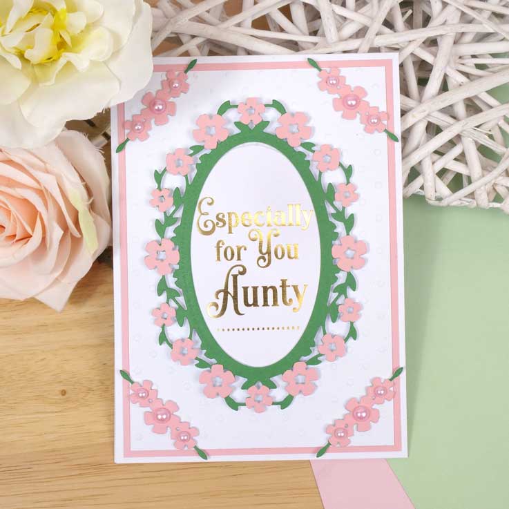 The Moonstone Dies - Blossoming Frame & Flourishes die set includes a stunning oval frame with delicate florals and foliage. Also included is a straight edged oval die allowing you to create mats and layers, or it can be used to cut into the outer floral frame if desired. Frame sentiments and verses, images, die-cut centrepieces, stamped images and more!