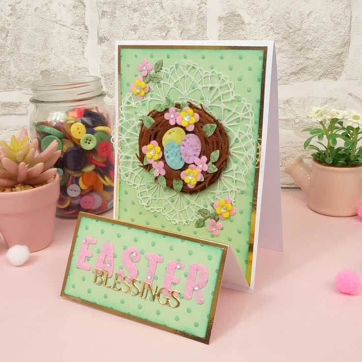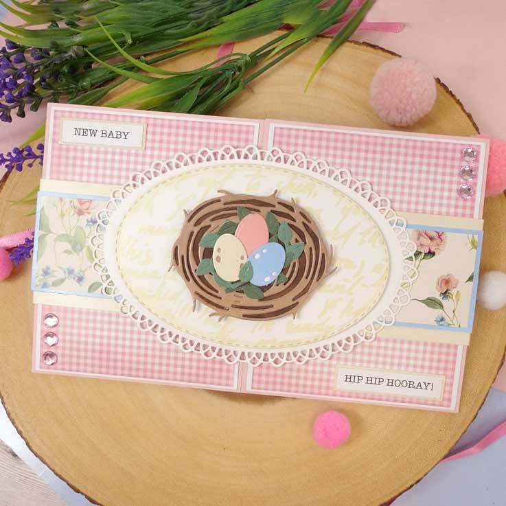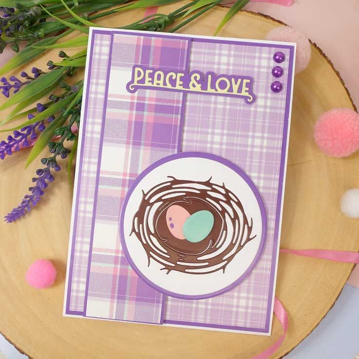 Cut the nest pieces from the Moonstone Dies - Cosy Nest & Eggs die set and layer to create a dimensional nest to hold eggs, foliage or a feather, all included in the set. Use the eggs separately and cut from two different tones of coloured cardstock and layer, allowing the darker colour to show through the cutout detail within the egg. Add colour to the elements using Prism colouring mediums or try cutting from Kraft cardstock, lightly patterned papers or even material like felt.