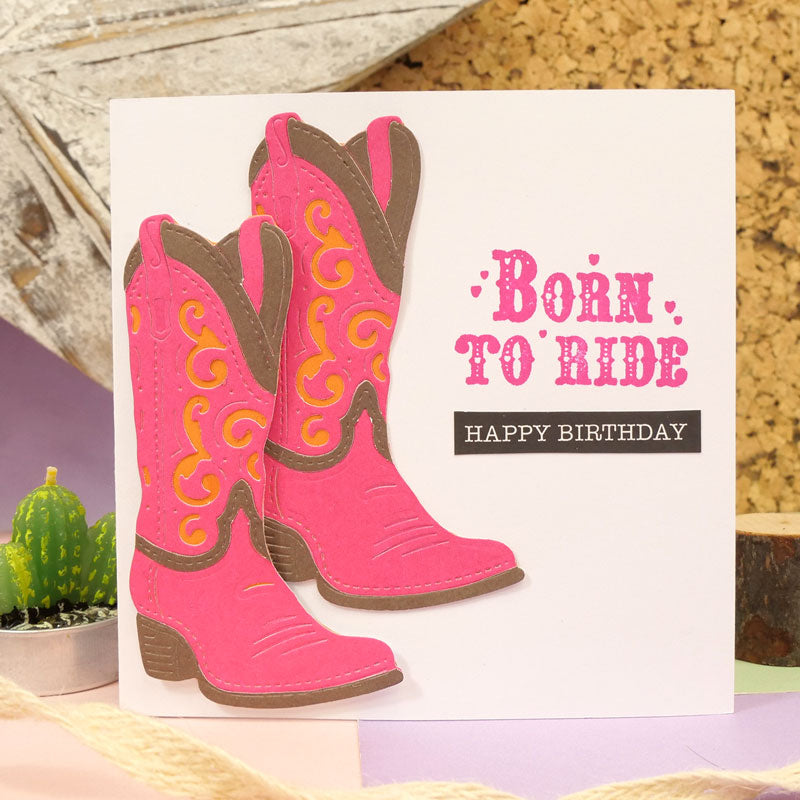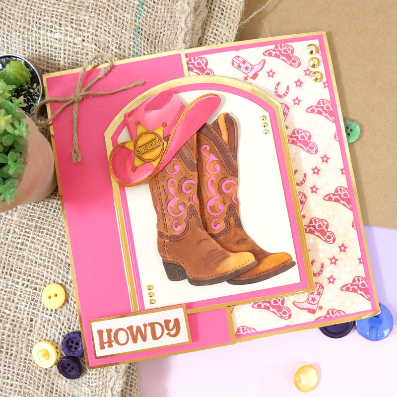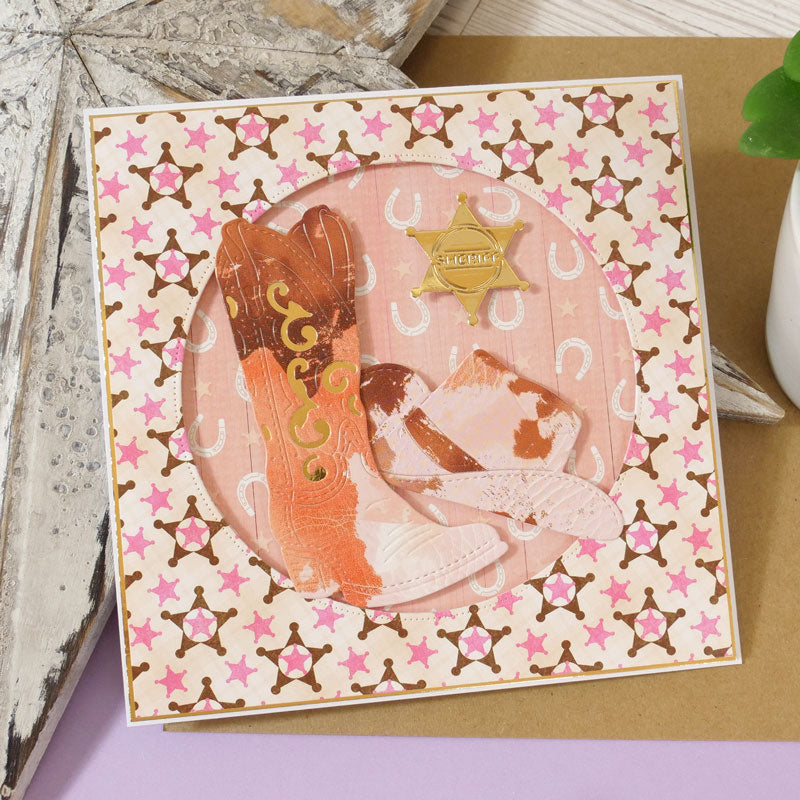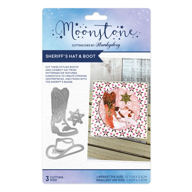 Moonstone Dies - Sheriff’s Hat & Boot die set includes a fantastic sheriff boot, decorated with classic swirl details and stitching. Cut two boots to create a pair, ideal for a centrepiece alongside the cowboy hat and sheriff’s badge. The stunning level of detail on all three dies allows for easy colouring using Prism colouring mediums, or alternatively cut from coloured or lightly patterned papers.