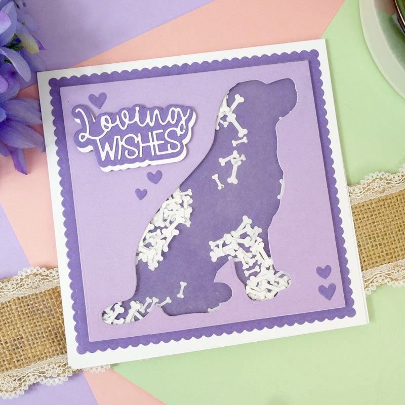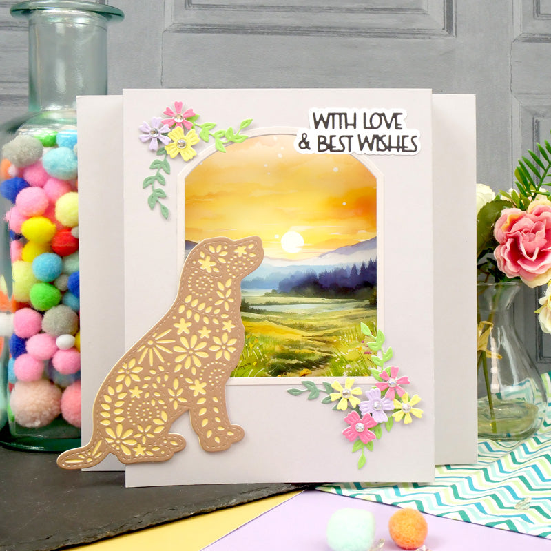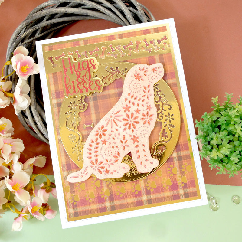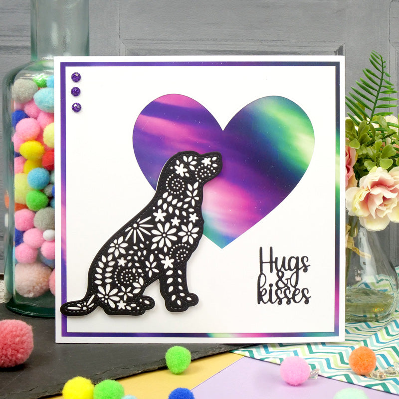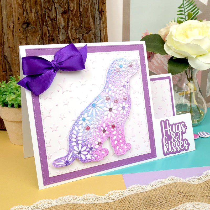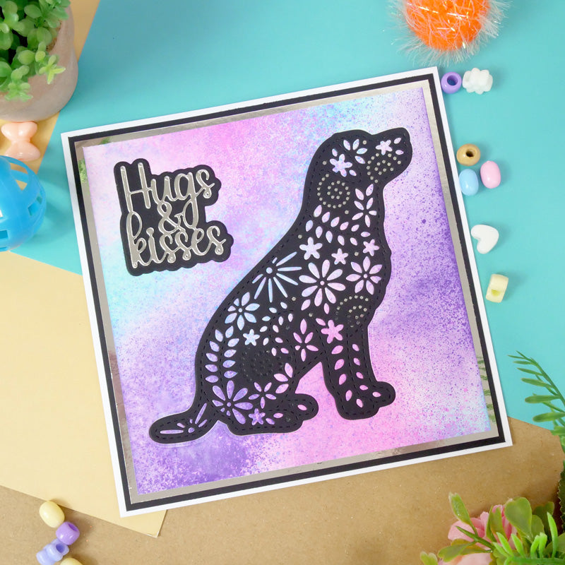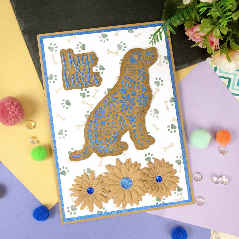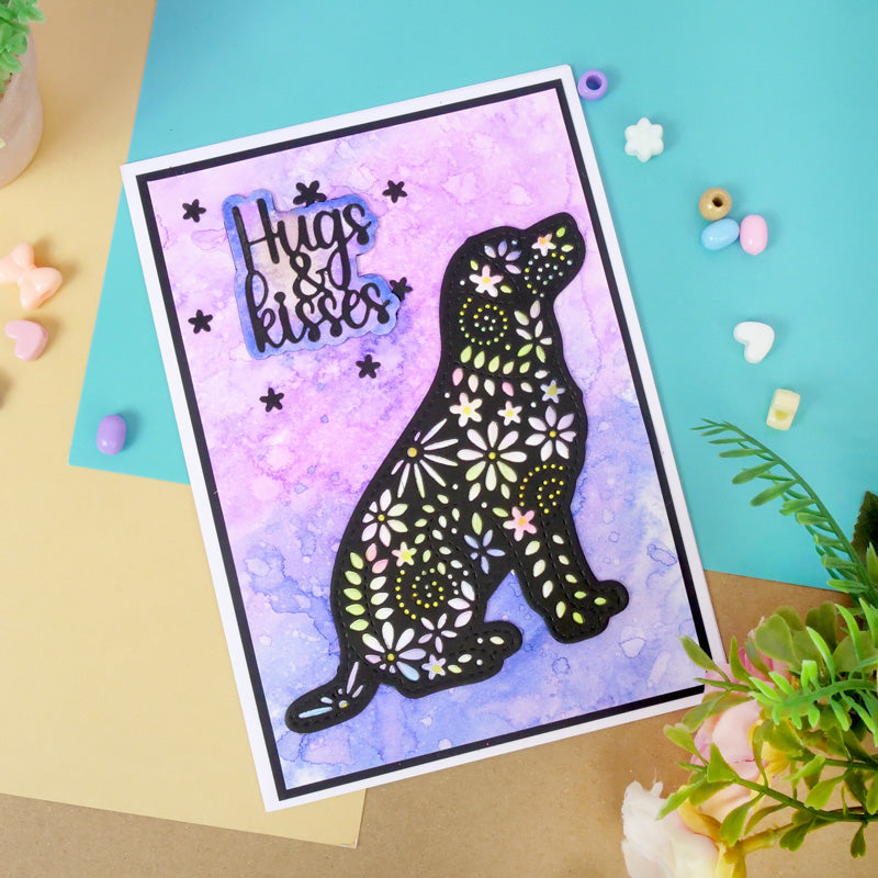 Create sweet pup cards with the Moonstone Dies - Pretty Petals Dog die set. Use the inner die to cut directly into your cardstock to reveal a stunning floral and filigree detailed pattern with a stitched dog-shaped border. Alternatively, pair with the outer mat die and cut from Adorable Scorable Cardstock, Mirri, Shimmer or Kraft Cardstock for a pretty centrepiece that you can layer onto a card front. The pretty puppy can also be layered over inked or coloured cardstock to really make the filigree detail pop. Complete your card or crafty project with the sweet sentiment die on the set that reads ‘Hugs & kisses’ along with the co-ordinating mat die.