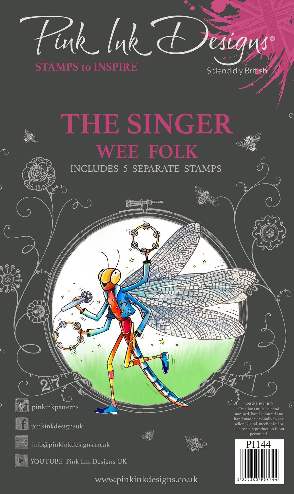 This A6 stamp is part of the Wee Folk series of stamp sets. The beautiful dragonfly is centre stage and dancing around holding the microphone and a couple of tambourines as well. All of the stamps are hand illustrated and come with additional elements for you to create a happy scene. Lots of fun to colour whatever your favourite medium is. All of the Wee Folk Series work brilliantly together. These stamps can be used with all sorts of medium including paper, card, mdf etc. Ready to mount on an acrylic block the stamps can be used with ink pads, paint, or used with pigment and embossing powder. They are suitable for any other surface depending on the ink choice. Store flat away from heat and sunlight. Deep etched, quality photopolymer. Designed and made in the UK. A6 size set. Main stamp 14.5 x 11.0 cm 6 separate images. 1 main singer, 2 caterpillars, 1 fern and ‘Life is a song sing it’ sentiment.