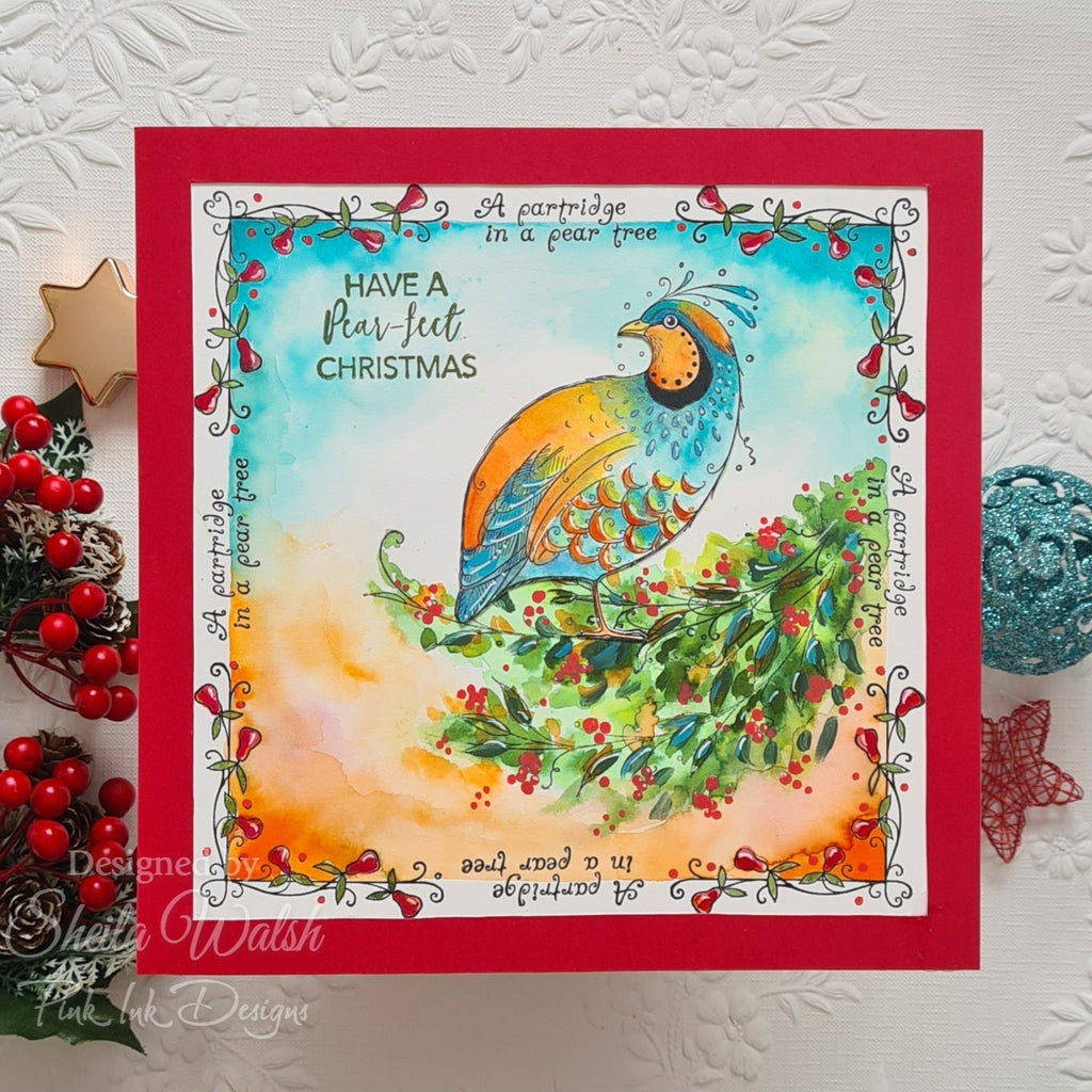 Pink Ink Designs – Partridge In A Pear Tree – Clear Stamp Set – From the Christmas Series these intricate hand drawn stamps are truly unique. The stamp set contains fifteen stamps perfect to use for festive paper craft and fabric projects. Echoing the famous Christmas carol, this A Partridge In A Pear Tree set features an adorably illustrated partridge surrounded by an abundance of festively decorated pears. The sweet partridge and delightful pears work in harmony to lend a quaint, vintage touch to your holiday crafts. The set allows you to stamp your very own 12 Days of Christmas scene, with lots of stamps to create the festive design. Comes with an array of elements including a main image of a partridge plus some extra elements and festive sentiments to finish off your Christmas project. Ready to mount on an acrylic block the stamps can be used with ink pads, paint, or used with pigment and embossing powder. They are suitable for paper, fabric, or any other surface depending on the ink choice. You can also spritz the fabric with water after stamping but before heat sealing to create lovely watercolour background washes. Store flat away from heat and sunlight. Designed and made in the UK from deep etched, quality photopolymer. A5 size clear. 15 stamps.