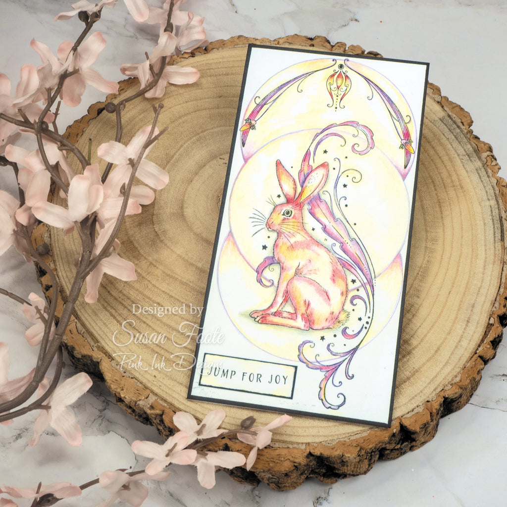 This clear photopolymer stamp set, Heavenly Hare is part of the Fauna Series from Pink Ink Designs. This stamp set features ten beautiful stamps. These stamps come ready to mount on an acrylic block. Simply adhere to an acrylic block and use with your favourite inks, markers, embossing powders, and other crafting mediums. These stamps can be used on cards, scrapbook pages, and other paper crafting projects. They are suitable for paper, fabric, or any other surface depending on the ink choice.