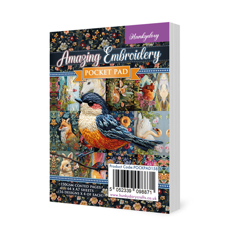 Create beautiful cards and project designs perfect for all occasions with this super handy Pocket Pad! The colourful A7-sized book contains 64 pages covered from edge-to-edge with the most delicate embroidered effect artwork - including stunning landscape scenes, florals, butterflies and bees, birds, a unicorn, bunny and more! Each image has beautifully sewn and colourfully stitched feel, all ready to be made into breathtaking toppers for your card makes and incorporated into your projects.