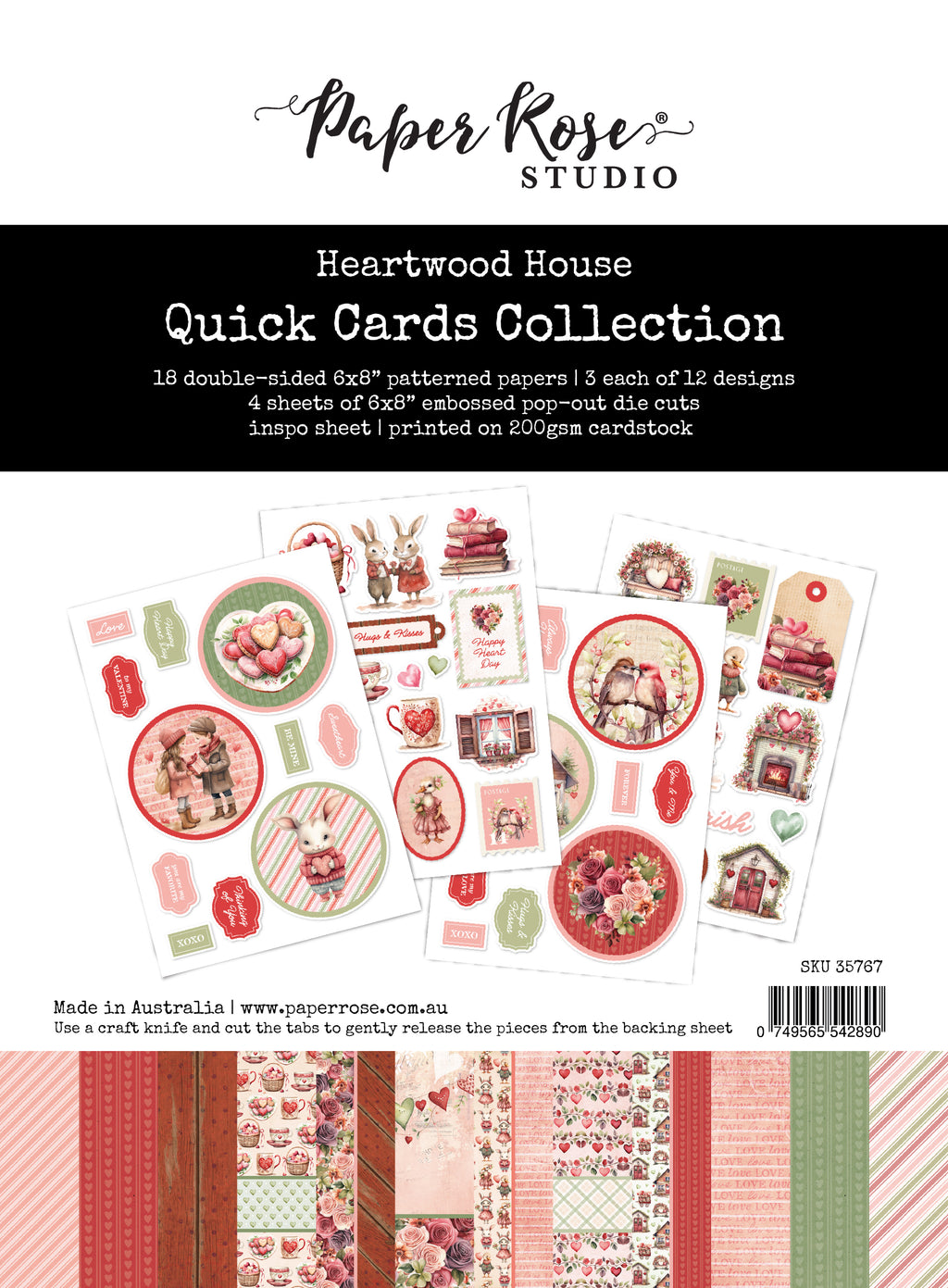 Celebrate love with the Heartwood House Quick Cards Kit, featuring a romantic vintage rustic aesthetic in warm pink, red, and green tones. The papers in this set showcase cozy home scenes and delightful scenes of animals embracing Valentine's Day spirit, surrounded by abundant florals, decorative hearts, and cherished classic Valentine imagery. The die cuts in this set complement the papers featuring adorable children and animals, home scenes, and florals, plus lots more classic Valentine themed designs and inspirational sentiments to finish off your projects. Share the love with this charming romantic collection!