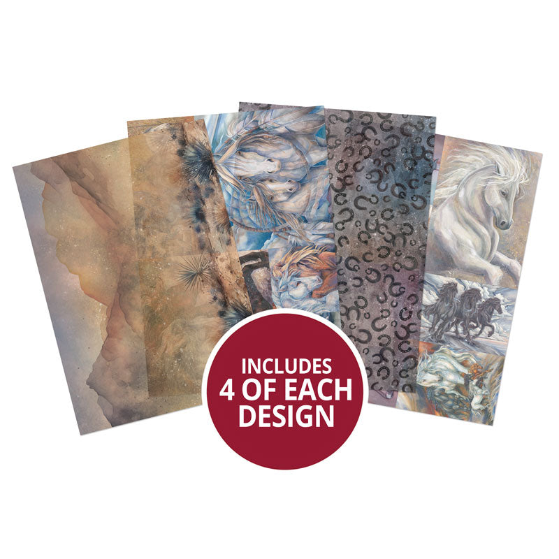 The Running Free Printed Parchment features 4 different designs; one mountain landscape, an all over horse shoe pattern and two pages of our stunning Running Free horse artwork ready for you to cut out. The translucent parchment will softly overlay and complement the Running Free collection beautifully, it is also great for fancy projects such as lantern windows etc.