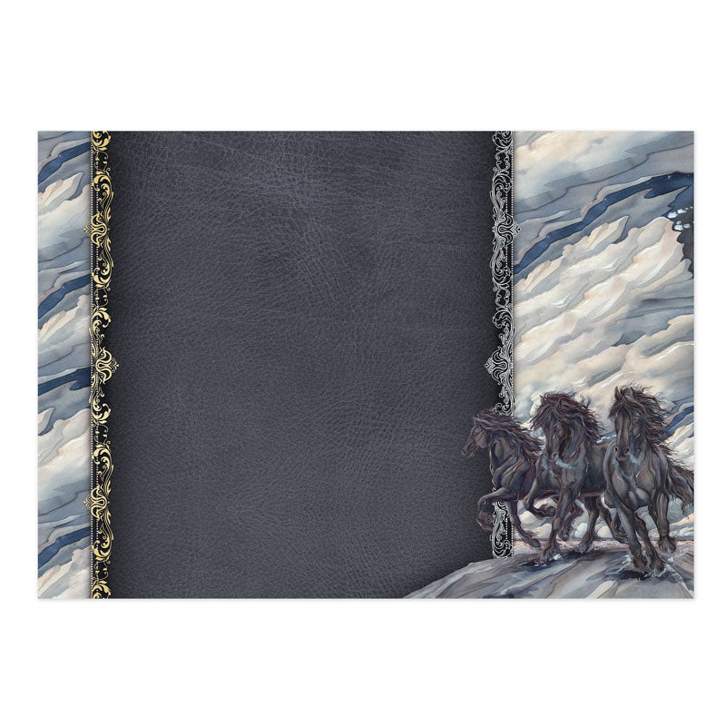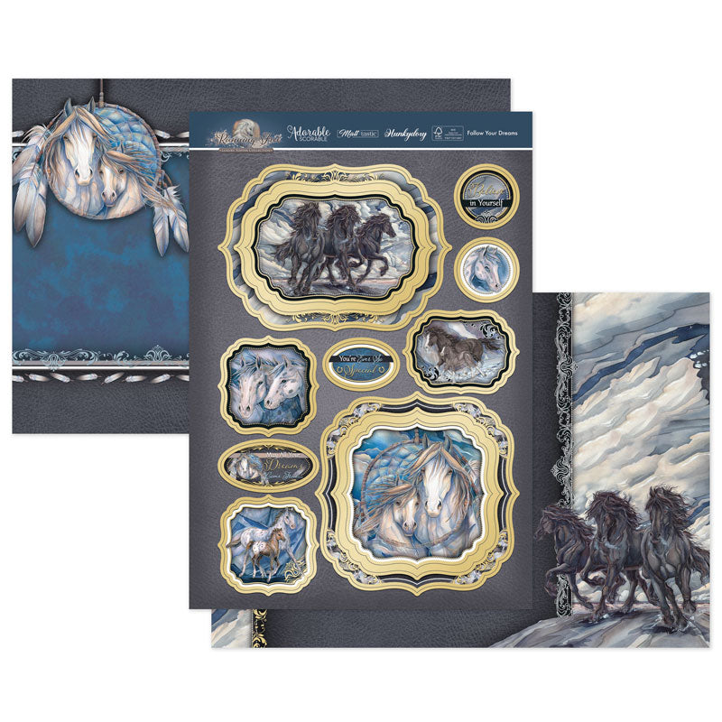 The Running Free Luxury Topper Collection has an inspirationally strong yet wild and free look and feel. Featuring beautifully illustrated horse images, all adorned with golden foil swirls, feathers, leaves and complimenting pretty distressed textures.