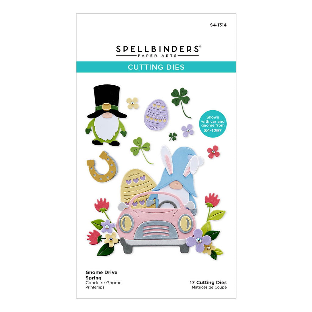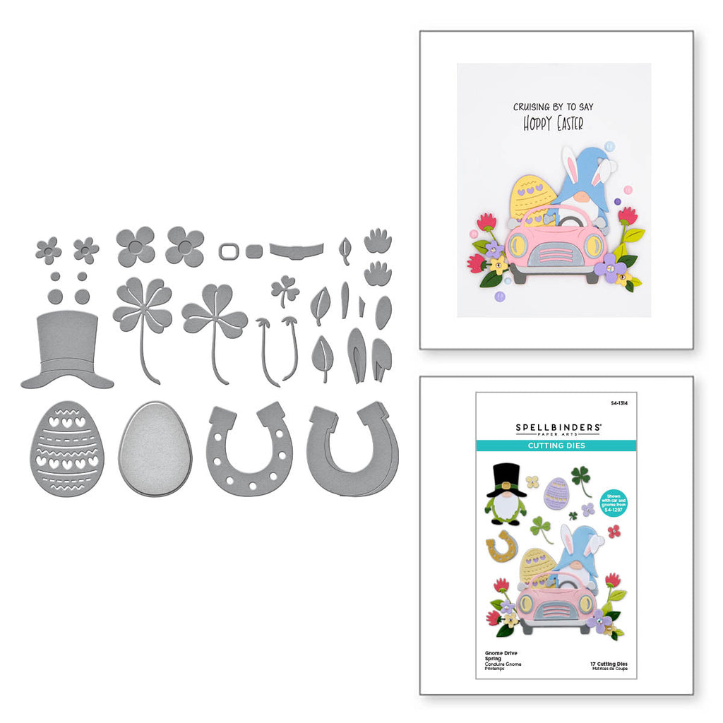 Gnome Drive Spring Etched Dies are part of the Gnome Drive Collection. There is everything Spring in this set of 17 thin metal cutting dies! Included in this offering is flowers, Easter egg, St. Patty’s Hat and more. Imagine the Gnome in his floppy ears cruising around town…so cute! It works well with S4-1297 Gnome Drive Holiday Etched Dies.