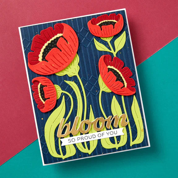 Fresh Picked Sentiments Etched Dies is part of the Fresh Picked Collection with a set of nine thin metal cutting dies. The sentiments include bloom, hello, make, a, wish, for, you, hi, smile, and thanks. All are in a casual script font in lower case. Make a one word sentiment or a fun phrase…you choose.