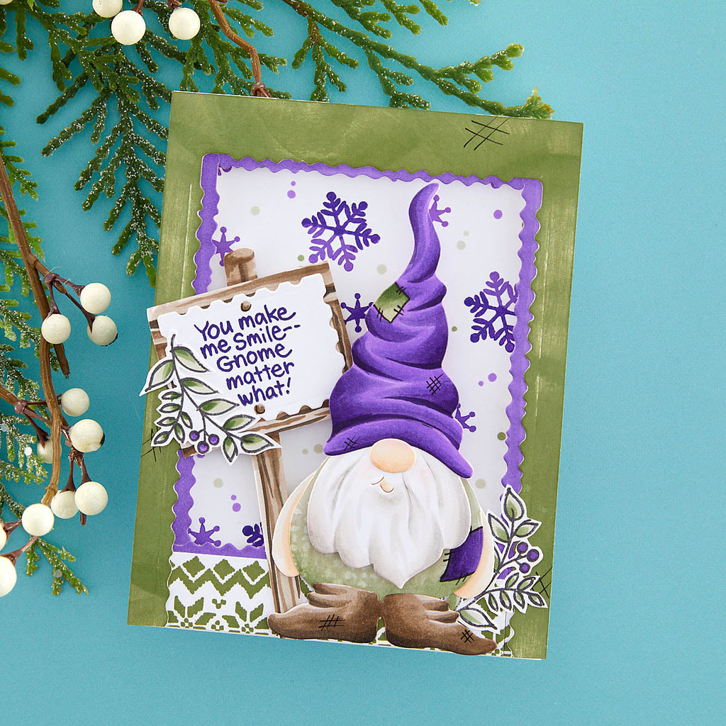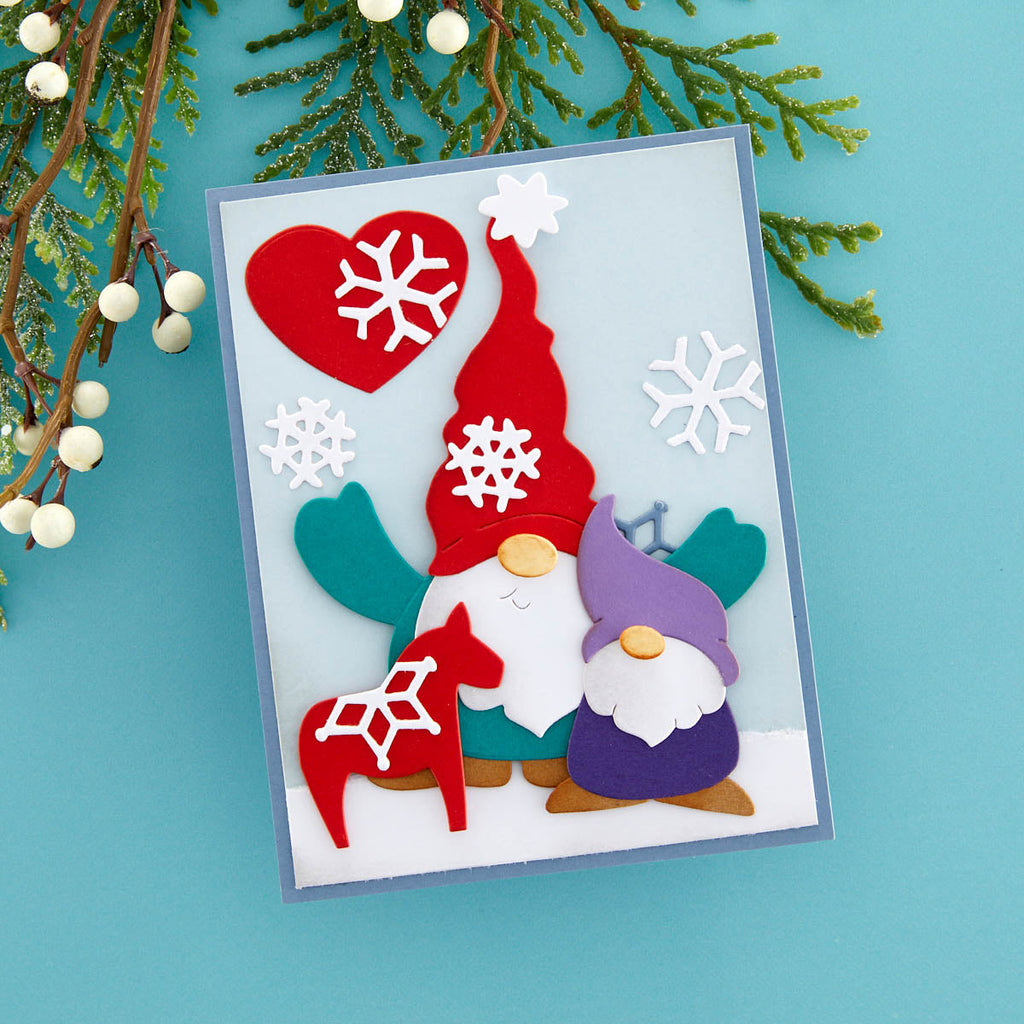 Stampendous Gnome Hugs Etched Dies are part of the Holiday Hugs Collection. This set of 16 thin metal cutting dies when assembled creates a whimsical and fun Gnome with his arm wide open to give a big hug! Also in the set is a sweet smaller gnome.Finished Large Gnome measures at 3.60 x 4.96 in./9.10 x 12.60 cm and Finished Small Gnome measures at 1.83 x 2.65 in./4.70 x 6.70 cm. Works well with STP-204 Gnome Hugs Sentiments Clear Stamp Set.