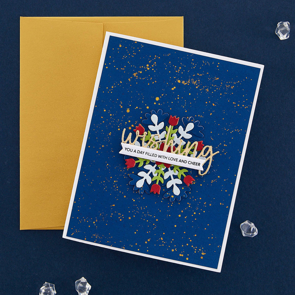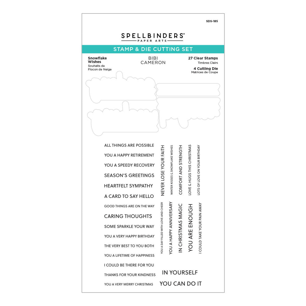 Snowflake Wishes Clear Stamp & Die Set is from Bibi's Snowflakes Collection by Bibi Cameron. This fun set of 27 clear stamps and four thin metal cutting dies creates a variety of sentiments with the help of the three sentiment dies: Sending, Wishing and Believe. Just stamp your greeting to complete the phrase. Stamp in the banner die to make it stand out or pop up for dimension! Lots of options!