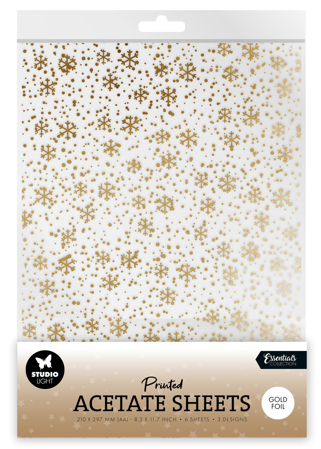 This set includes 6 acetate sheets, with 3 designs, 2 of each design. These sheets have beautiful snowflake imagery highlighted in gold foil perfect for Christmas and Winter cards and projects.