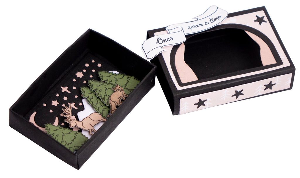 This stamp set includes a deer, a bear, a fox and an owl, a tree, banners and text 'Once', 'upon a time' and 'Keep exploring'.  This stamp set combines perfectly with the matchbox cutting die SL-ES-CD114. Together you can make a theater matchbox with a fun nature scene inside. The animals, tree, banner and text stamps combine perfectly with the cutting die set.