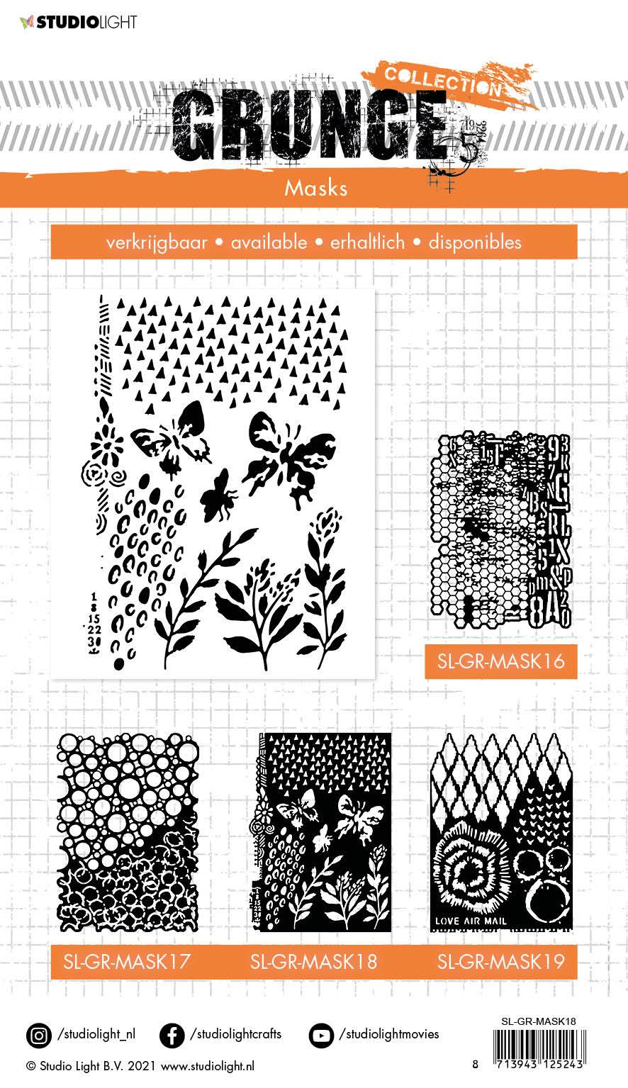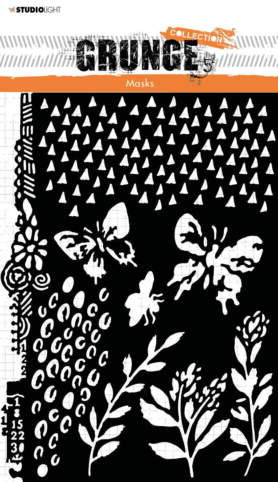 Use this mask with your favourite inks, dies, paints and pastes to create a grunge pattern background featuring some butterflies and flowers for your cards and art journal pages.