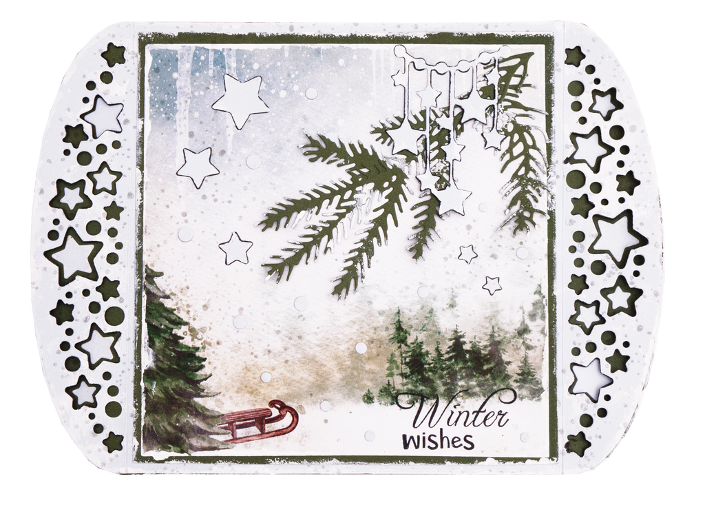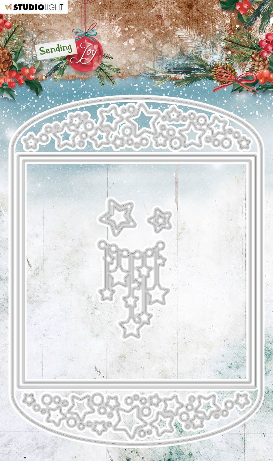 Sending Joy is a classic Christmas collection with a contemporary twist: traditional colors like red and green are combined with fresh blues and warm browns. Sending Joy features classic Christmas elements like trees, bells, gifts, ornaments, holly and ribbons in a modern watercolor style. This card shape cutting die cuts a fancy frame with a star edge and would be great to use for your Christmas themed cards or projects.