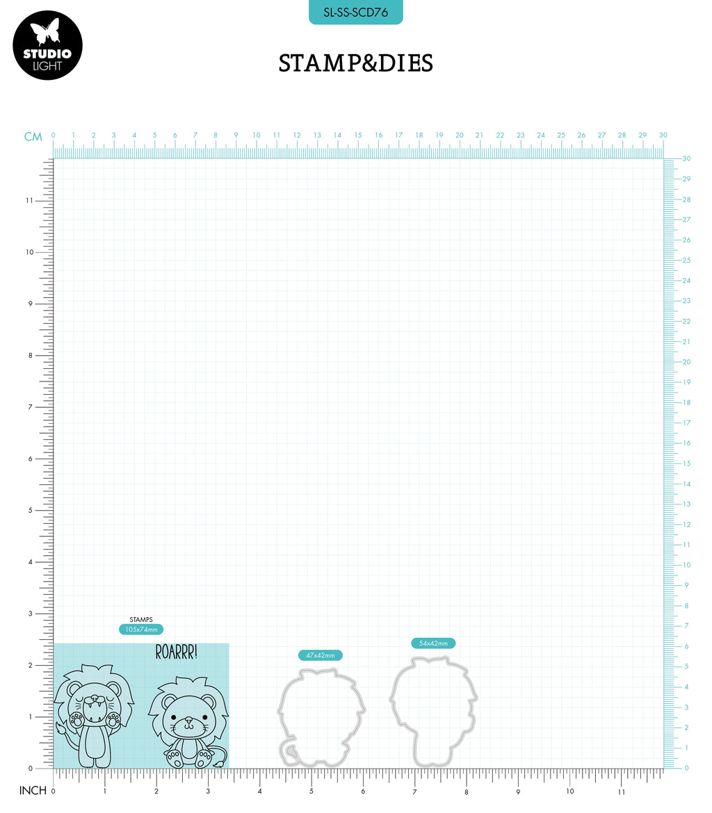 Great for building scenes this stamp and cutting die set can perfectly cut out the stamped elements. Elements include 2 adorable lions; one is roaring and one is sitting plus a label die and text stamp 'ROARRR!' perfect for finishing off your projects. The stamps are made of polymer and are soft and textured, fitting snugly within the matching dies. They can be used for scrapbooking, mixed media, journaling and card making. Suitable for all die-cutting machines. Part of the Sweet Stories Collection. 3 Dies, 3 Stamps.