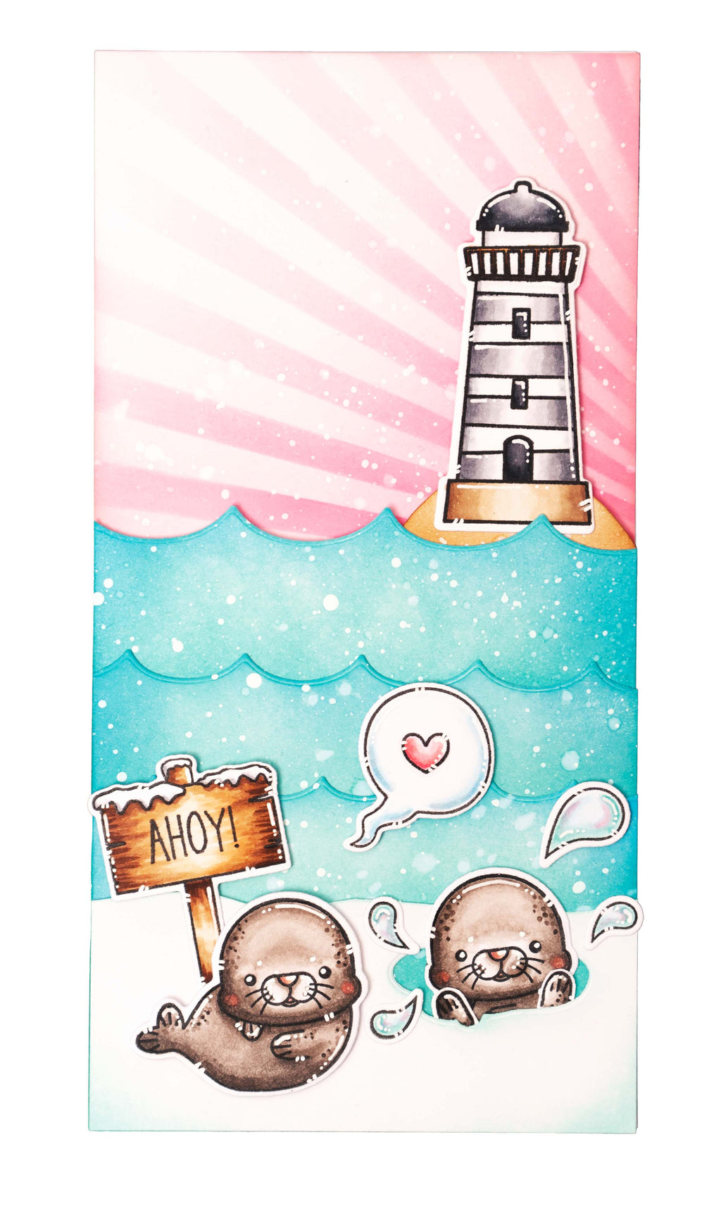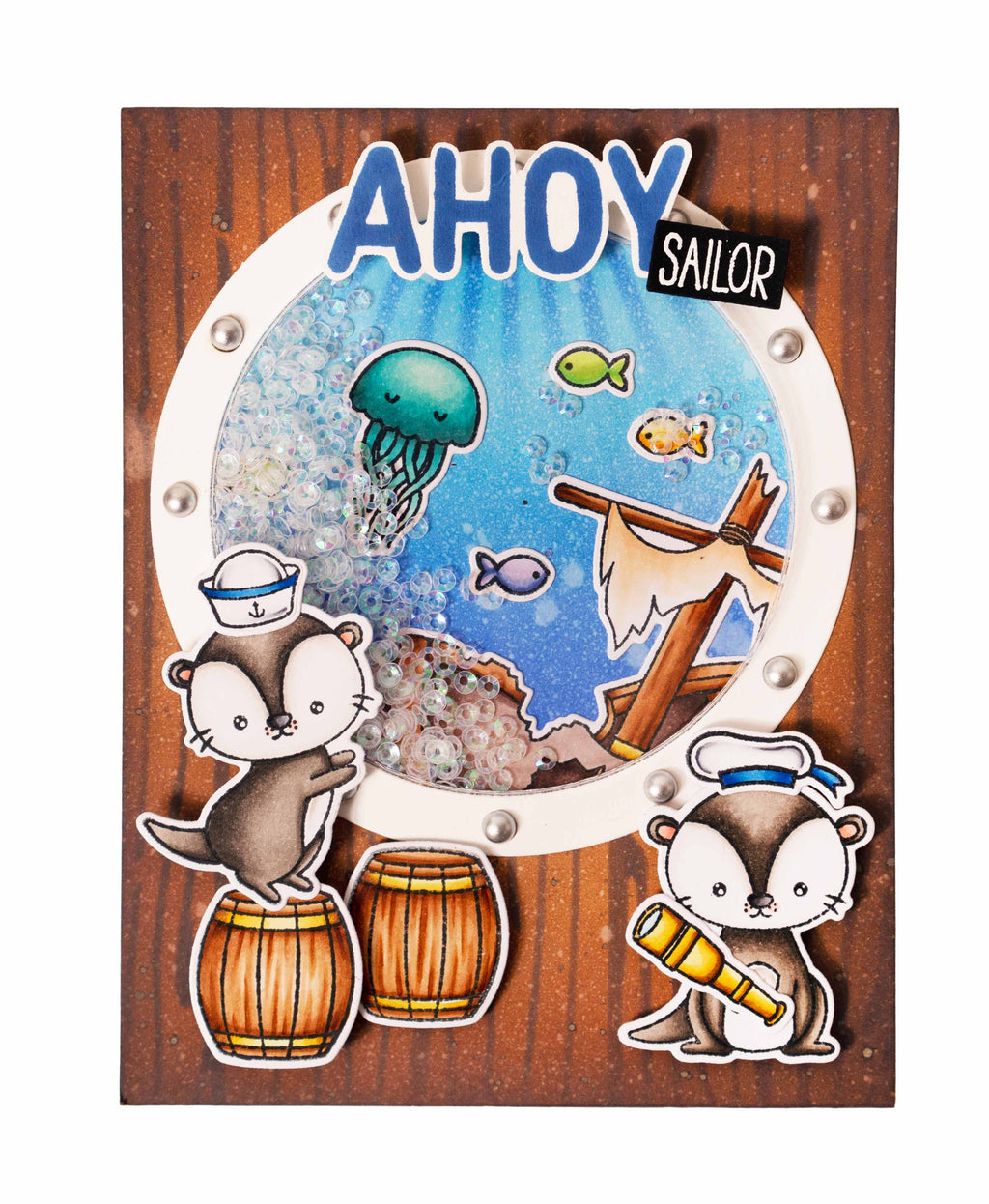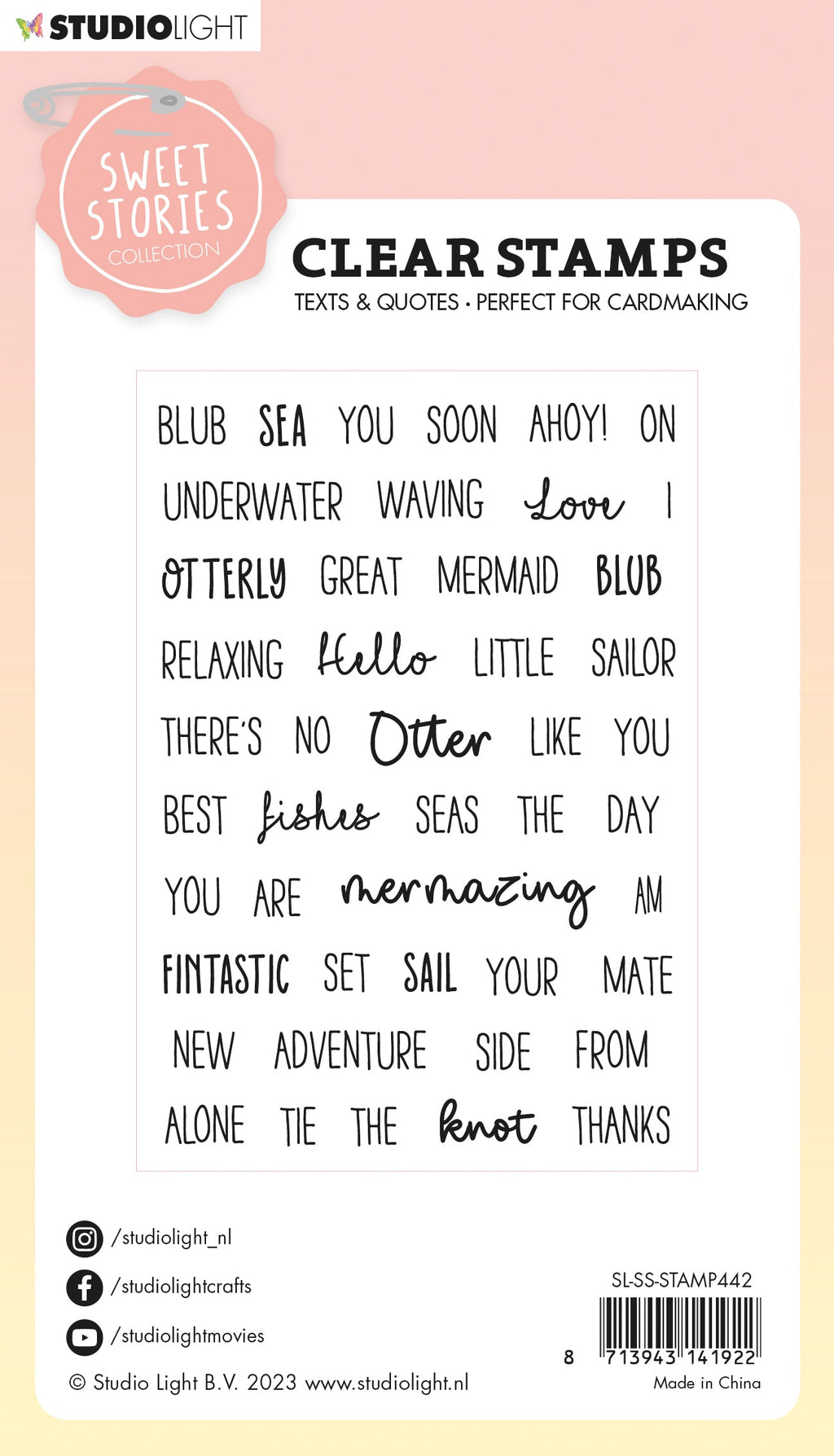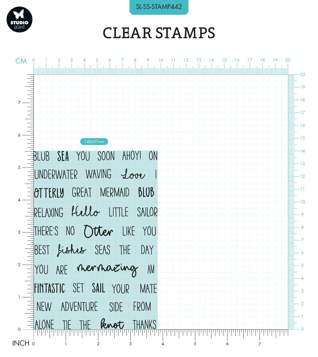 This clear stamp set includes fun nautical themed text. Includes 'Mermaid', 'Fintastic', 'Underwater', 'Otter', 'Ahoy!', 'Blub', 'Sea', 'You', 'Soon' and many more. They can be used for scrapbooking, journaling and card making.