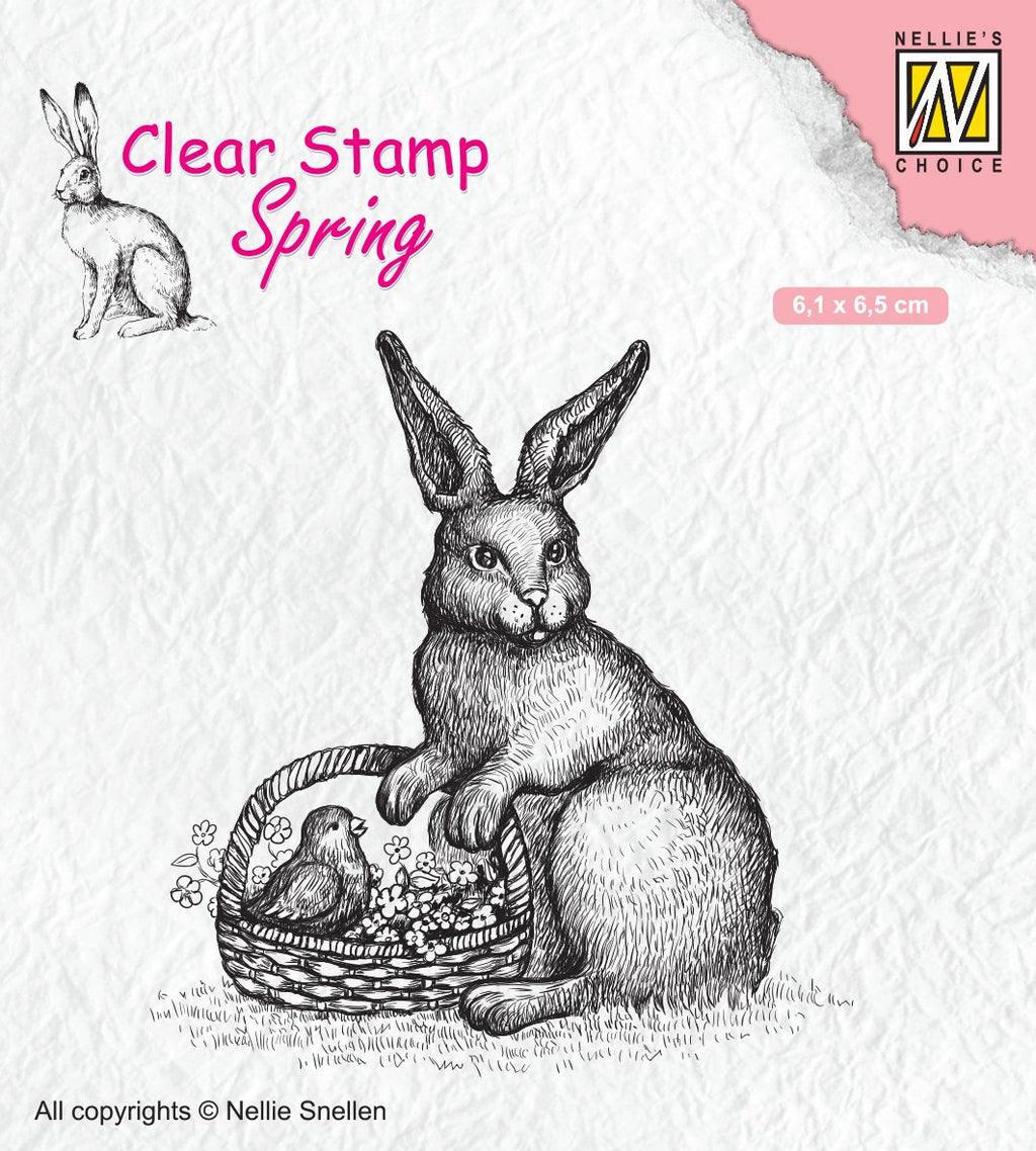 This clear stamp shows a spring Easter hare, or rabbit with a basket.