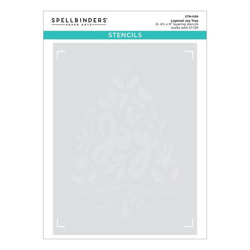 These Layered Joy Tree Stencils are made of durable mylar stencil material. The four stencil sheets create a beautiful Christmas tree design framing the word, Joy. It works well with S1-126 Joy Tree Etched Dies. The stencil enhances the sentiment by adding shadows and surrounding the phrase with lovely holiday foliage.