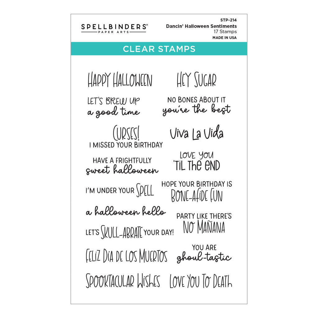 Dancin’ Halloween Sentiments Clear Stamp Set is part of the Dancin’ Halloween Collection. The set of 17 clear stamps includes an assortment of fun Halloween-themed greetings. Hard to choose a favorite! They are designed to work with an acrylic block and made in the USA.