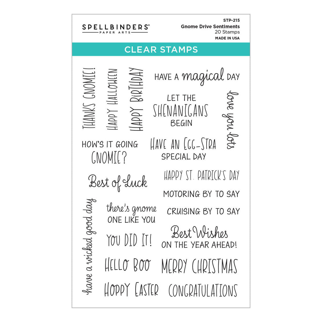 Gnome Drive Sentiments Clear Stamp Set is from the Gnome Drive Collection. This set of 20 stamps is full of funny and quirky Gnome phrases that are perfect for this collection and can be used all year long. Add them into your Gnome Drive creations to bring a smile or chuckle to the recipient! They are designed to work with an acrylic block and made in the USA.