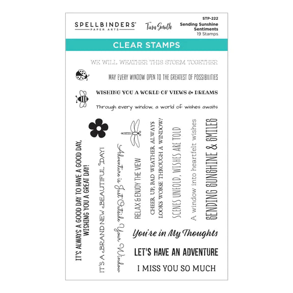 Sending Sunshine Sentiments Clear Stamp Set is from the Windows with a View Collection by Tina Smith. This fun 15 sentiments goes well with the collection. It includes clever phrases such as We will Weather this Storm Together; Through Every Window, a World of Wishes Awaits; It’s a Brand New Beautiful Day; Relax & Enjoy the View; Scenes Unfold; Wishes are Told; and four sweet icons. They are designed to work with an acrylic block and made in the USA.