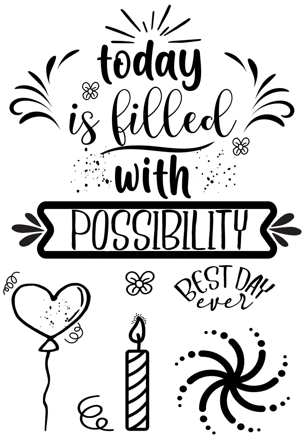 A wonderful array of birthday themed images and inspirational phrases in this A6 size clear stamp set. This set will work well for cards, scrapbook pages, mixed media and journals. Clear stamps make positioning simple and accurate ready for you to use mounted to an acrylic block or use on its own. The stamps are suitable for paper, fabric, or any other surface depending on the ink choice. Check out the Creative Expressions YouTube channel for ideas. Made in UK. A6 size – 7 stamp set.