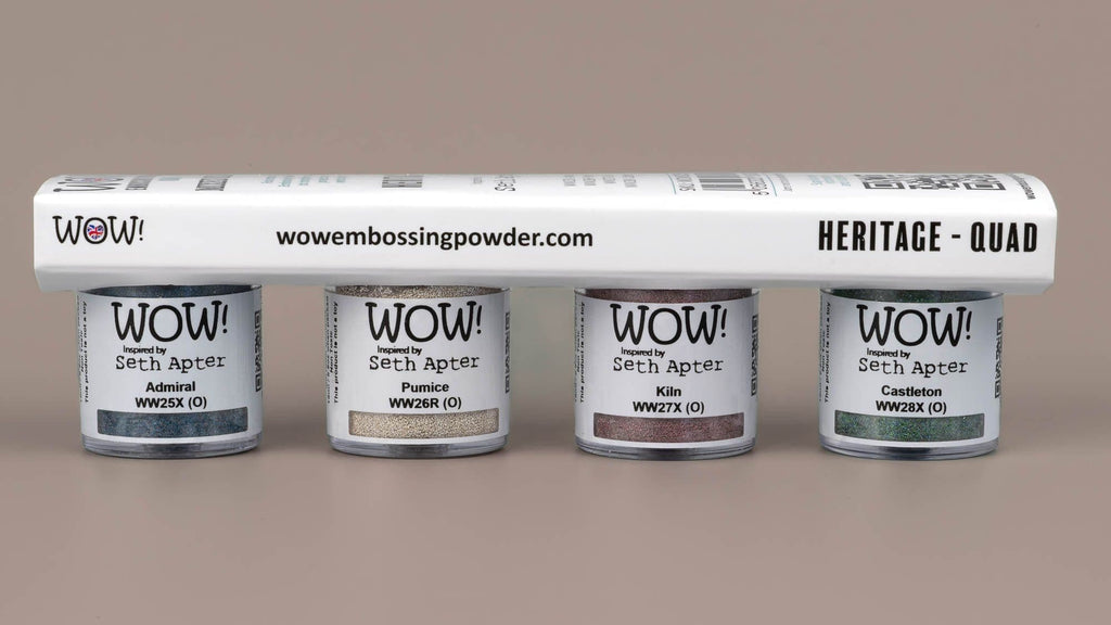 Step into layers of time and texture with the Heritage Quad, a limited edition release by Seth Apter for WOW! Embossing Powder. These four new powders blend raw earthy tones with muted metallics and rugged opacity — the hallmarks of Seth’s unmistakable mixed media style.